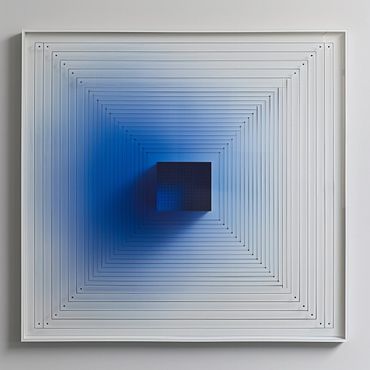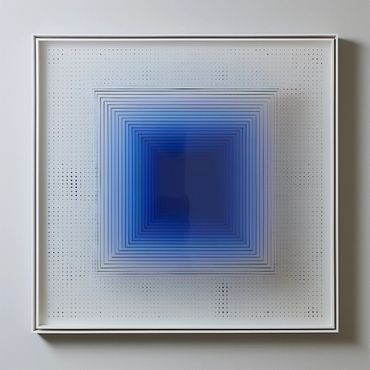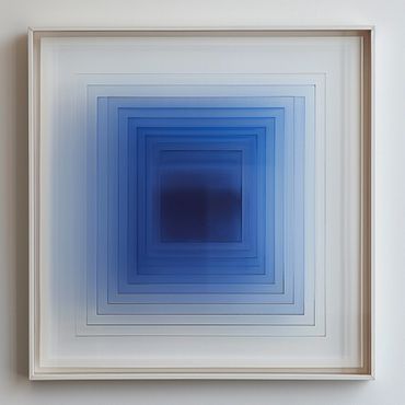 Esta obra, inspirada en los tonos cambiantes de las nubes, utiliza capas de acrílico con cortes precisos para crear una profundidad hipnótica. Las tonalidades de azul se degradan hacia el centro, evocando una sensación de calma y serenidad, como mirar al cielo a través de un portal geométrico.