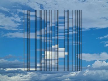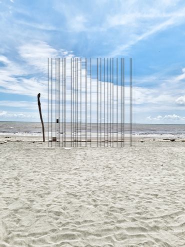 Esta obra combina la serenidad de una playa con la intriga de estructuras etéreas. Las líneas verticales parecen una puerta a otra dimensión, suspendida entre el cielo y el mar. Es un diálogo visual entre lo natural y lo artificial, desafiando nuestra percepción del espacio.